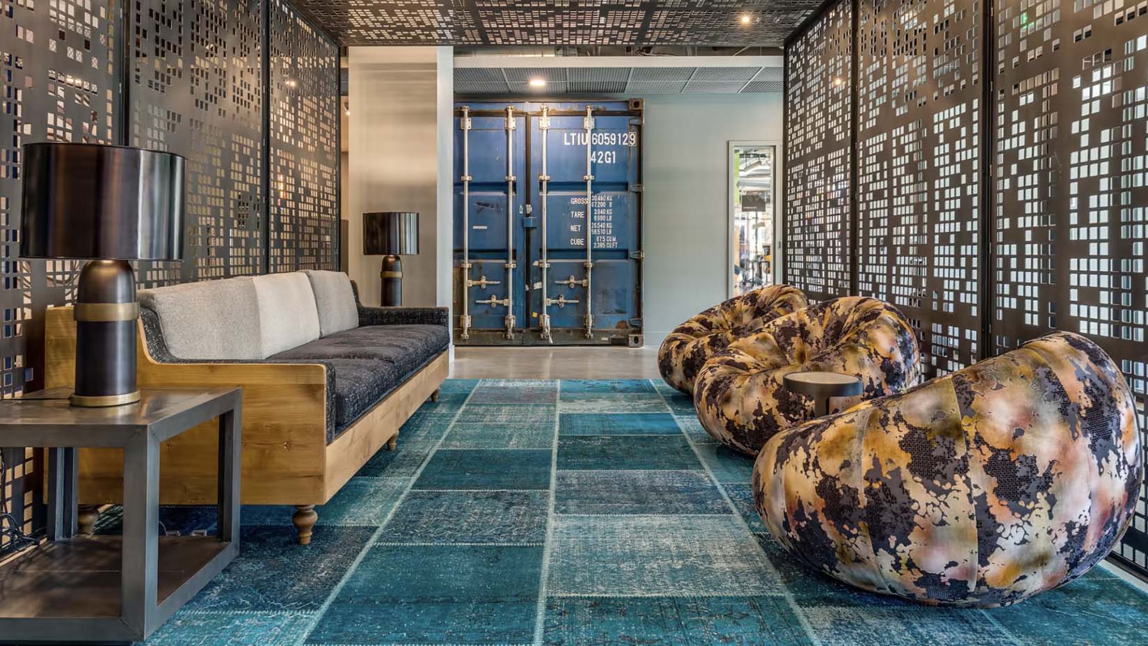 Bold textures, graphic screens, and a surprise container wall define this unforgettable lobby.