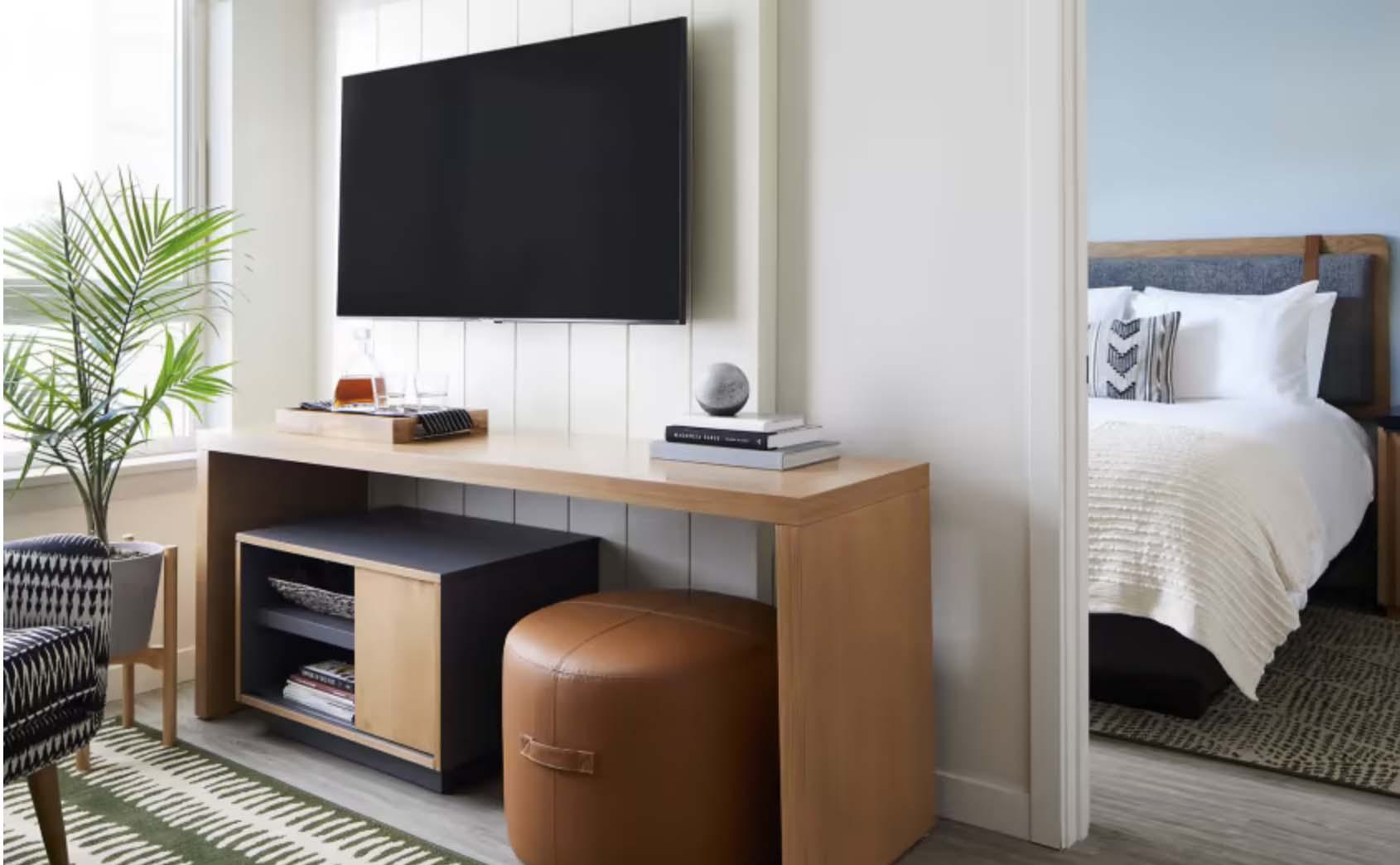 Style-forward spaces with wall-mounted, flatscreen TVs.